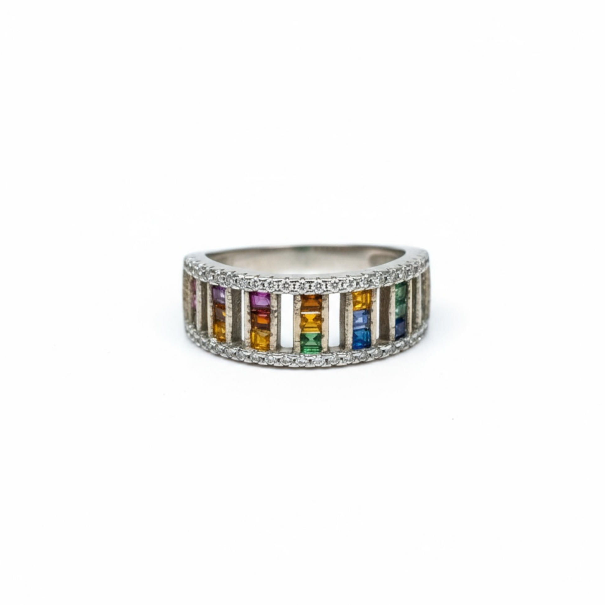 This Sterling Silver Multicolor CZ Ring features expertly crafted cubic zirconia stones in a vibrant array of colors, set in high-quality sterling silver. Its durable design promises lasting shine and elegance, while the multicolor stones offer versatile style, making it an ideal accessory for both everyday wear and special occasions. Meticulously finished for comfort and brilliance, this ring combines craftsmanship with sophisticated flair.